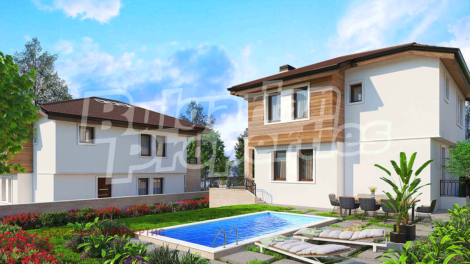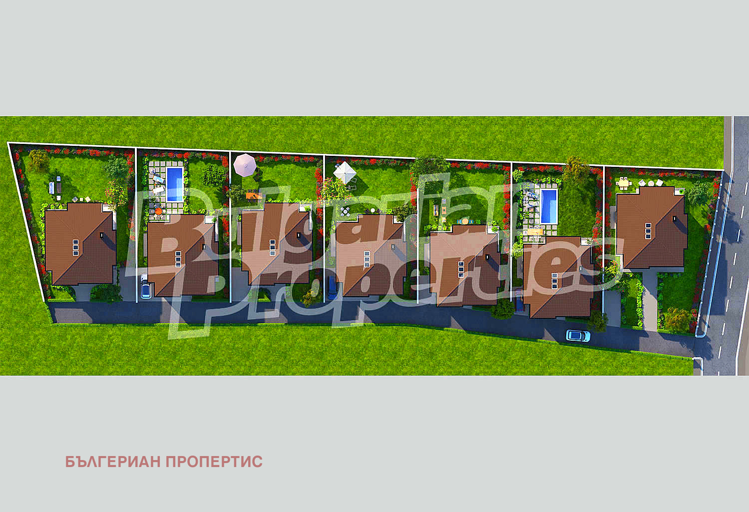 Към всяка къща има самостоятелен двор с възможност за изграждане на басейн и паркомясто включено в цената.