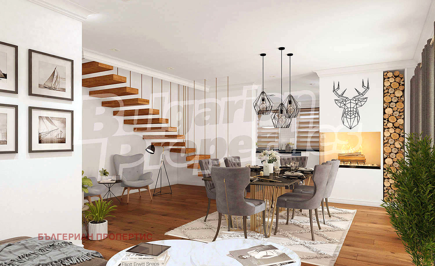 Първи етаж (100.25 кв. м.) - входно антре, просторна дневна с интериорно стълбище и камина, кухненски бокс със складово помещение, спалня, баня, веранда с барбекю зона