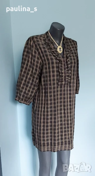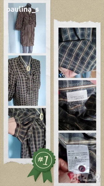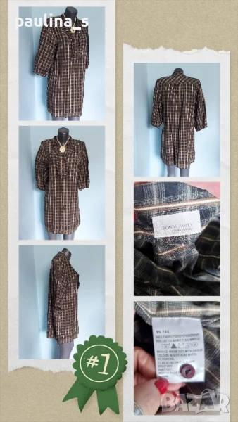 1️⃣ Колаж / Колаж / L / 2XL - "Bon'a Parte". Цената е крайна 29,99лв / 15 евро. Френска памучна рокля тип туника с висока яка и два реда жабо около бието. Моделът е прав с набор под раменната платка, ръкавите са буфан с дължина 7/8. Материята е 100 % органичен памук, десенът е е каре, има бежов, черен и тъмно зелен нюанси. Като нова е, без дефекти и етикет. Колието с огромен камък, също се продава за десет евро, при желание ще създам обява за покупка.