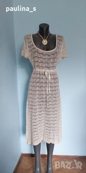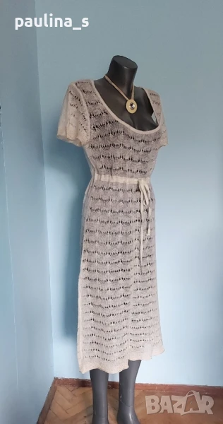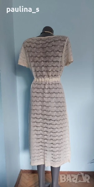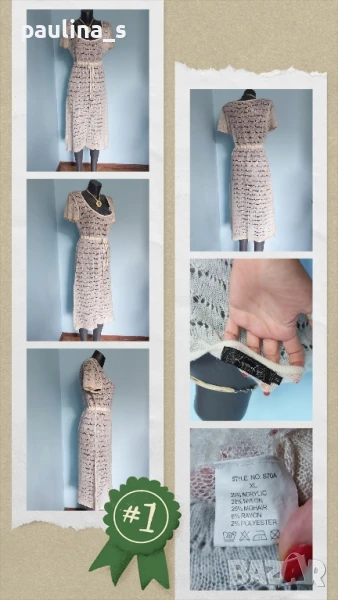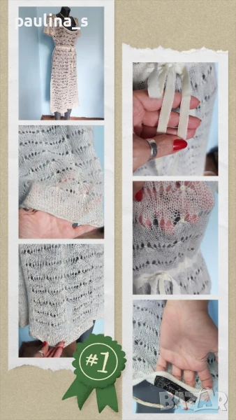 2️⃣. Колаж / L / 2XL - "Lipo Lipo". Цената е крайна 24,99лв / 17,5 евро. Разкошна дантелена рокля тип туника или мрежа за над други дрехи, единична бройка. Материята е фин мохер, машинно плетиво с голяма еластичност. Цвят Шампанско. Плетивото е рехаво, мъхесто и наподобява невероятна дантелена феерия. Подгръдната обиколка се регулира с кадифен ширит, пронизан под бюста. КРАСОТА! На места има фина златиста ламена нишка, предната част е допълнително декорирана с пайети. Дрехата е нова, без дефекти и етикет.