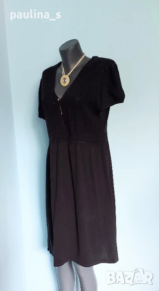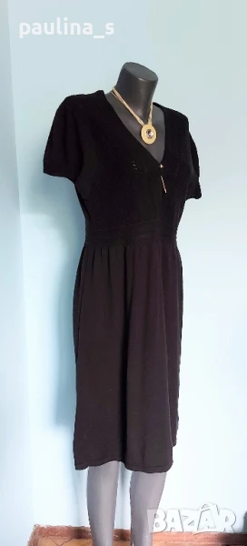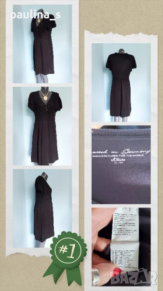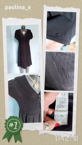 3️⃣. Колаж / 2XL / 3XL - "S'Oliver". Цената е крайна 49,99лв / 25 евро. Изумително красива плетена рокля, преждата е 50% памук и 50% полиестер. Цветът е Графит. Моделът е обран, съобразено с размера, горната част е с прихлупване - гръцко деколте и е от оребрена дантела, ръкавите са различна плетка, Буфан. Перфектна дреха, метално лого, като нова. Колието с огромен камък и иглата се продават отделно 10 евро.
