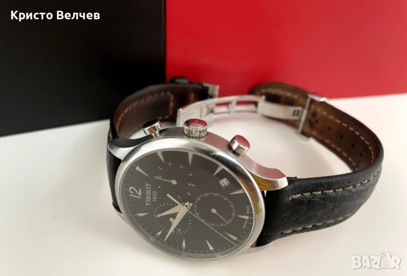 Часовник Tissot / Модел T063.617.16.057.00 Следи от употреба - само леко износване на каишката + дребни драскотини отзад. Почти не е използван. Закупен от Juliany за 965 лева. Стъкло и корпус без забележки - вижте снимките. Механизъм Вид: Кварцов G10.212 / швейцарско качество. Корпус: Размер дължина: 42 Размер ширина: 42 Водна устойчивост:3 ATM Вид стъкло:Сапфир кристал / не се драска. Каишка: Тип закопчалка: Пеперуда Бърза Смяна Каишка: Да Тип: Естествена кожа Цвят каишка/верижка: Черен Каишка: 20 мм