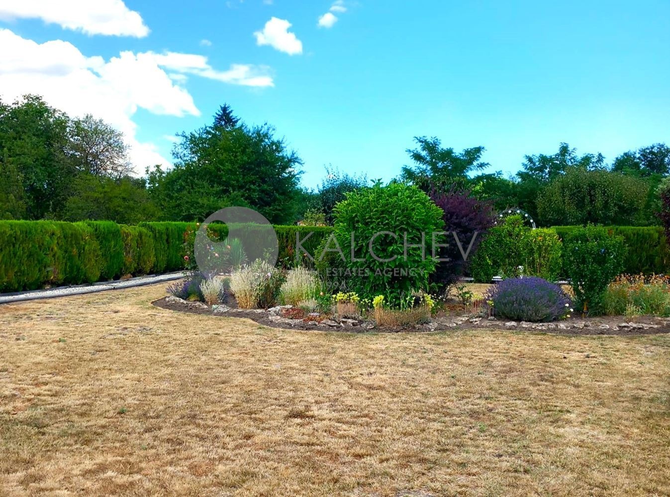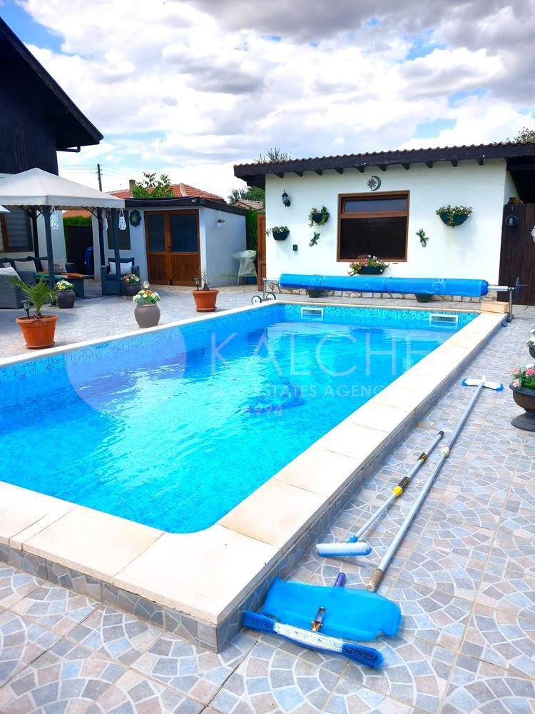 Парцел 1225 кв.м, с озеленени площи около басейна, беседка, барбекю.