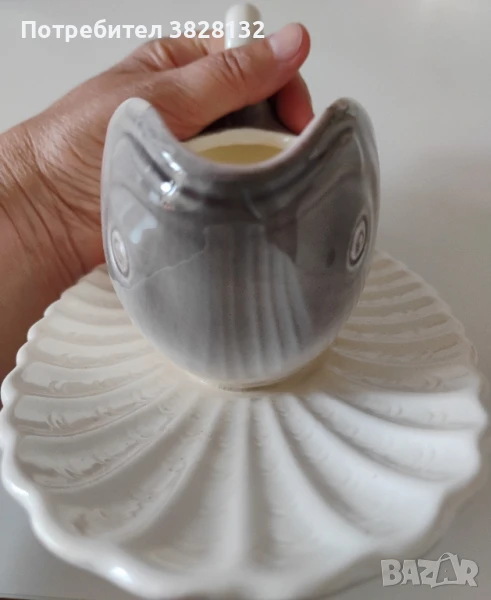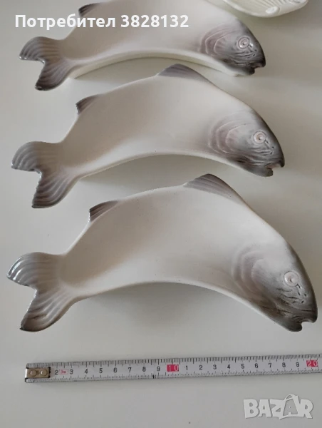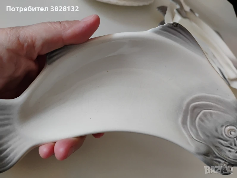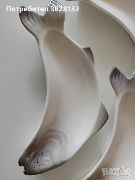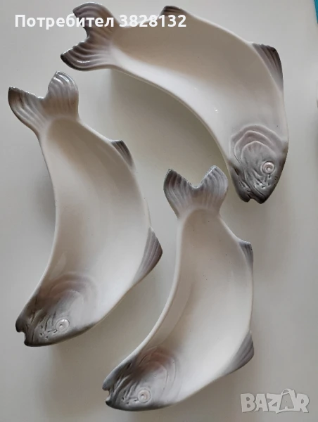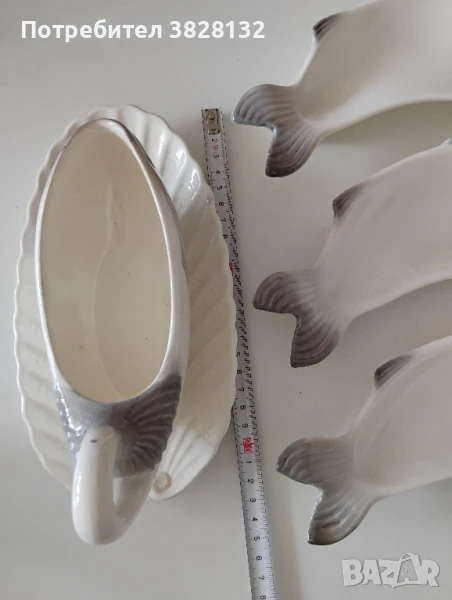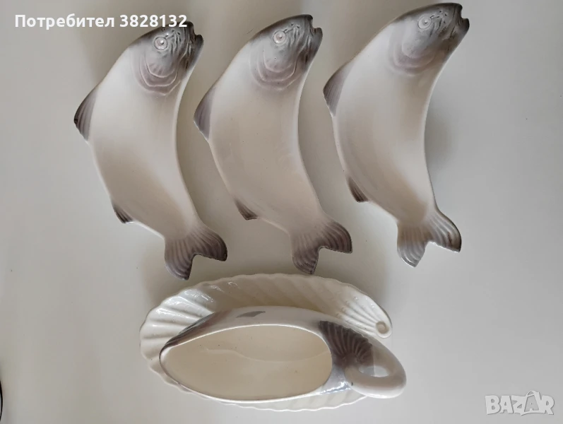 Ретро от 50-те години на миналия век. Порцелан. Винтидж комплект от 3бр. порцеланови чинийки за риба и 1бр. сосиера с подложна чиния във вид на мида. Първоначално тези чинийки са били предназначени да се поставят върху или до чинията, когато се яде риба, за да могат костите да се поставят в тях, наричали са ги бон дишес чиния за кости (от френски). Разбира се, сега те се използват и за сервиране на риба, рибна закуска или предястие. Дължина на сосиерата към22см, дължина на чинийките към 22см. Без забележки. Само едната от чиниите има кракле под глазурата, не пречи за използването. Моля, разгледайте и другите ми обяви.