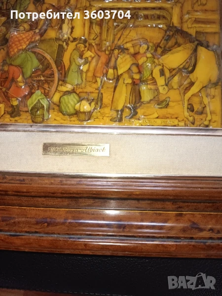 испанска картина стара дървена махагонова рамка много специална техника е приложена на тази картина досега не съм виждал такава рисувана и отгоре защитена със сол и прозрачно нещо не знам какво е размерите с рамката са 40 на 30 благодаря ви за вниманието който е познавач ще види качеството и начинът на изработка става за колекция за подарък за вкъщи да си го качи да си гледа на стената кой както сметне за Добре благодаря ми за вниманието Разгледайте и другите мои обяви