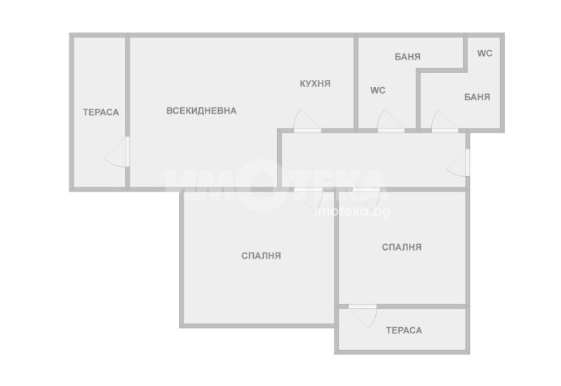 Жилището се състои от дневна с кухненска част, две спални, две комбинирани санитарни помещения, коридор, тераса към спалня, тераса към всекидневната.