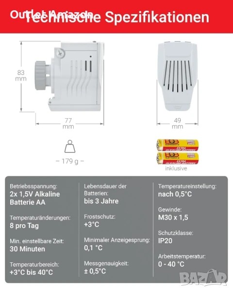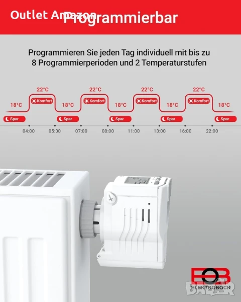 Интелигентно управление на отоплението: Радиаторният контролер ELEKTROBOCK HD13 ви позволява да програмирате индивидуално седмична програма с 8 времеви периода и 2 температурни стойности на ден. Така можете да контролирате всяка стая удобно и ефективно. ➡️ ЯСЕН ДИСПЛЕЙ: Дисплеят показва информация за отвореността на вентила в %, желаната температура и текущото време през 2-секундни интервали. Графика илюстрира напредъка на температурната програма. ➡️ ЕНЕРГОПЕСТЯВАНЕ С ОТКРИВАНЕ НА ОТВОРЕН ПРОЗОРЕЦ: Термостатът автоматично разпознава кога е отворен прозорец и затваря вентила незабавно, за да спести енергия. Идеален за ефективен контрол на отоплението. ➡️ ЛЕСЕН МОНТАЖ Радиаторният термостат е лесен за монтаж и не изисква източване на отоплителната вода или намеса в отоплителната система. Универсалната холендрова гайка е съвместима с вентили от най-популярните производители с размер на резбата M30 x 1,5 мм. ➡️ Допълнителни функции: Функцията Boost отваря напълно клапана за 20 минути, функцията против замръзване поддържа +3°C, корекция на измерената температура, автоматично настройване на времето за лятно и зимно часово време. Не е необходимо приложение или WiFi.