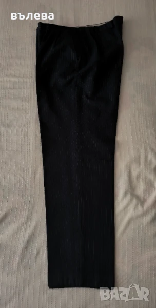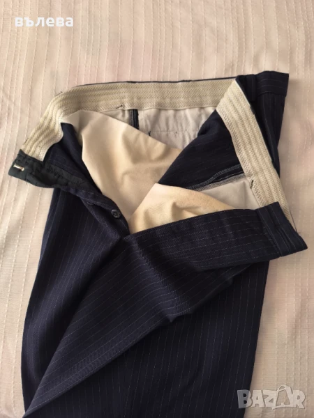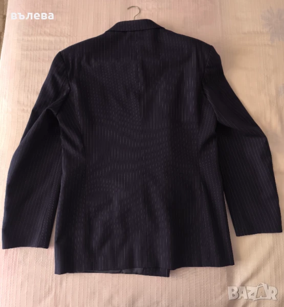 Вълнен костюм тъмно син цвят с тънки райета -сиво и бордо.Класическа кройка.Размери сако: дължина 82см, гръдна обиколка 120см, талия 110см, ханш 120см, дължина на ръкава 65см, широчина на ръкава 44см.Размери панталон: дължина 108см, талия 96см, ханш 120см, дължина на крачола 78см, широчина на крачола 66см.