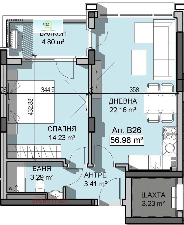 Жилището се намира на втори етаж с чиста площ от 56.98 кв.м., със следното разпределение: дневна с трапезария и кухненски бокс, спалня, баня с тоалетна, антре и тераса.