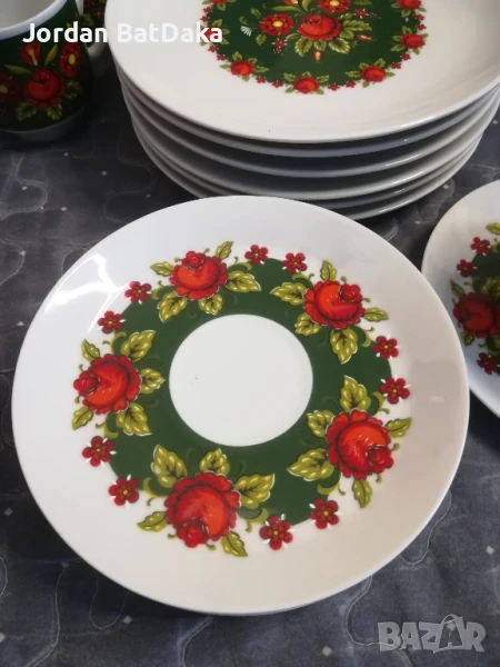 Страхотен сервиз от 6 чашки с чинийки и 6 десертни чинии за торта, пай, бисквити. Много хубави ярки цветове. Сервизът явно не е ползван, няма надраскано, чукнато или отлюспени места. Чашите както е видимо на снимката със стандартна чаша са идеални като размер за турско кафе, нито малки, нито големи. Тънкостенен порцелан. Чудесни за подарък, препоръчвам!