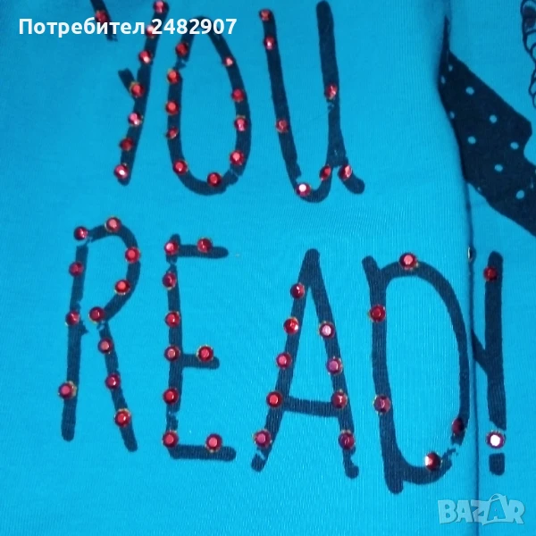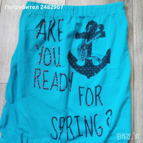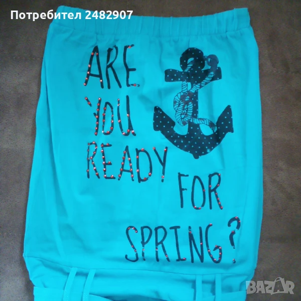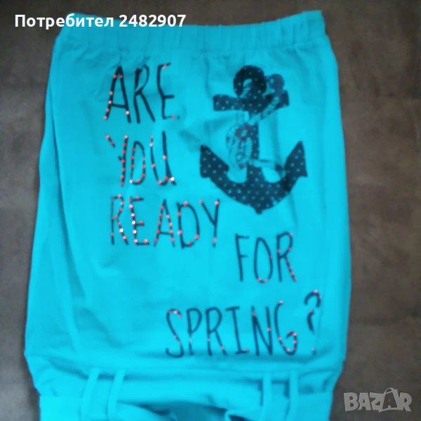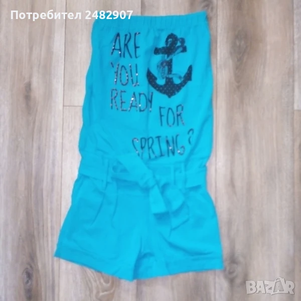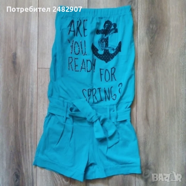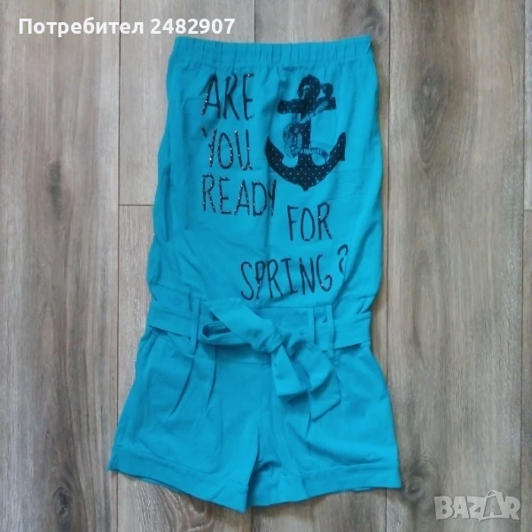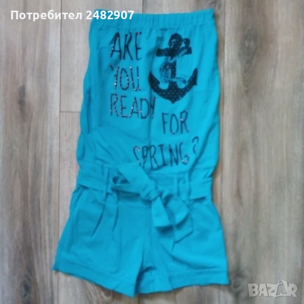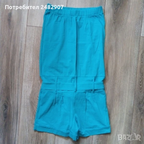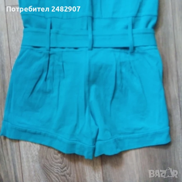 Памучен дамски гащеризон в тюркоазен цвят, размер S. Ширина в горната част - 28 см, ширина в талията - 35 см, ширина на крачола в долната част - 25 см, дължина от горната част до долу - 66 см, размери на колана - 3,5/158 см. Много запазен, почти не е използван, удобен, с ластик в горната част и гайки в талията. Без забележки, неразличим от нов.