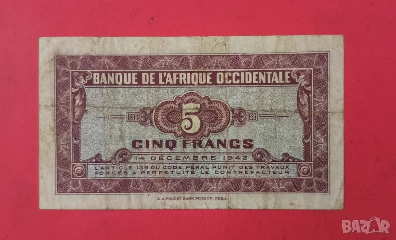 5 франка 1942 Френска Западна Африка 1 буква, широк подпис → Обява 51287174