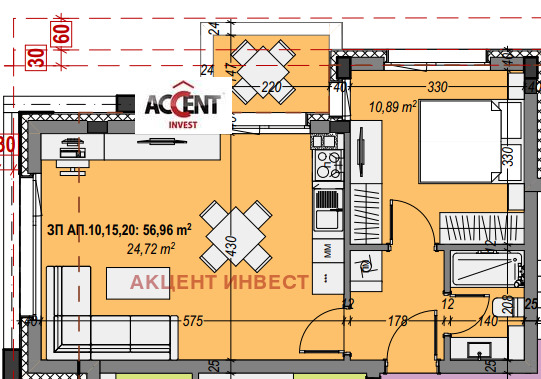 Жилището (Ап.10) е позиционирано на ет.2 от 5 и на площ от 64,54кв.м са разпределени: входно антре/ кородор, дневна с кухненска част- 25кв.м, спалня- 11 кв.м, баня с тоалет и тераса.