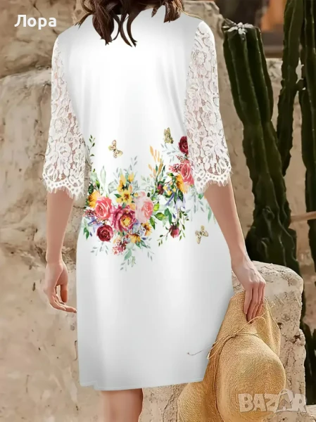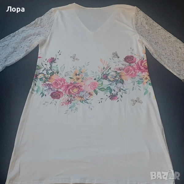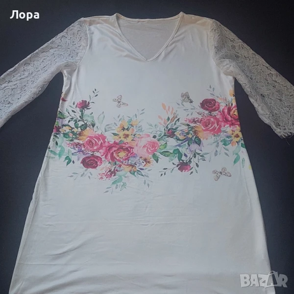 Нова дамска рокля в бял цвят с дантелени ръкави. Материята е фино трико. Има еластичност. Размери ширина от мишница до мишница 50 см. Дължина на роклята 91 см. Дължина на ръкава 46 см.