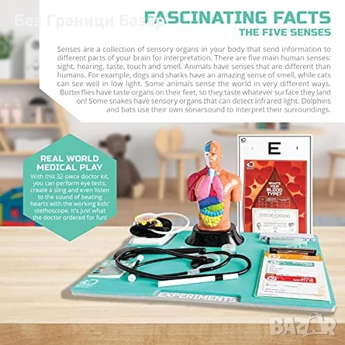 Реален стетоскоп, тестови карти за зрение, термометър и спринцовка