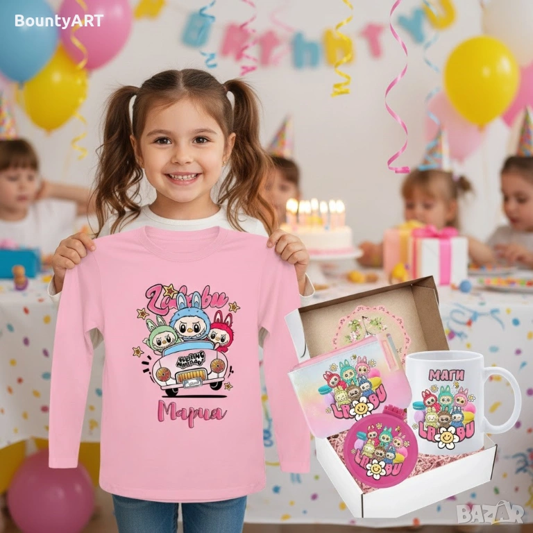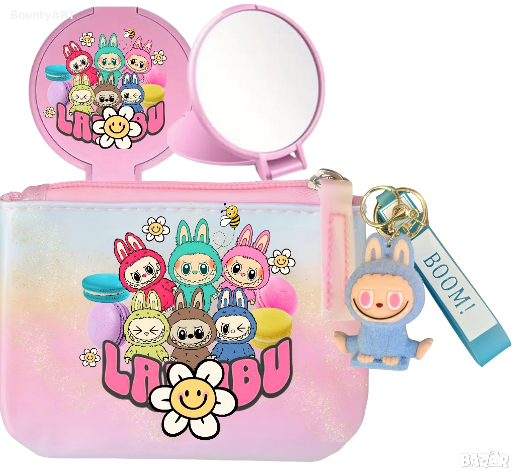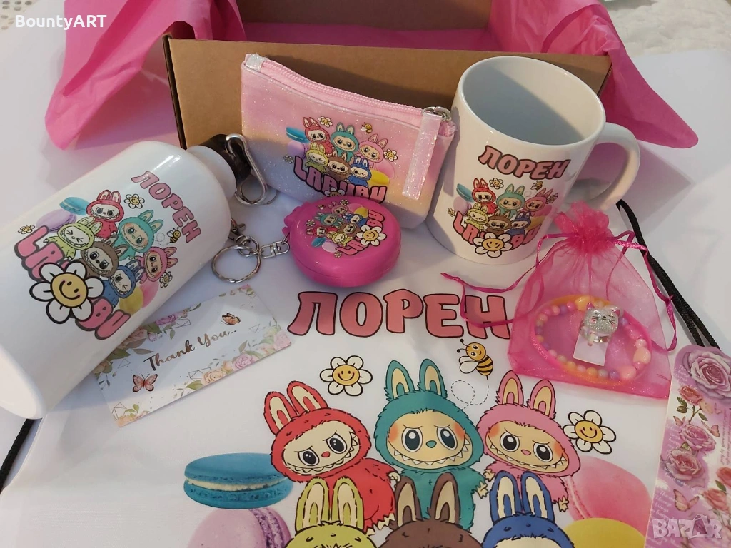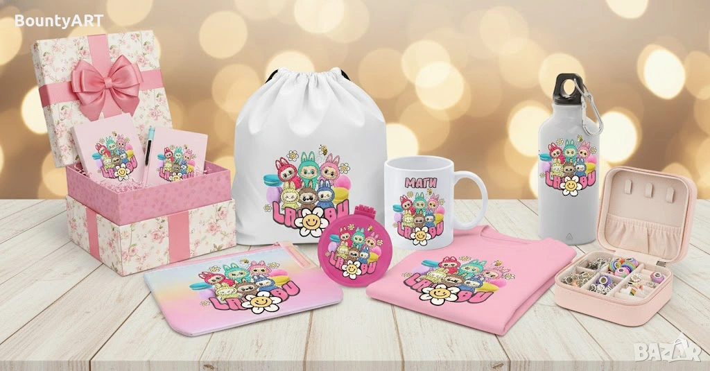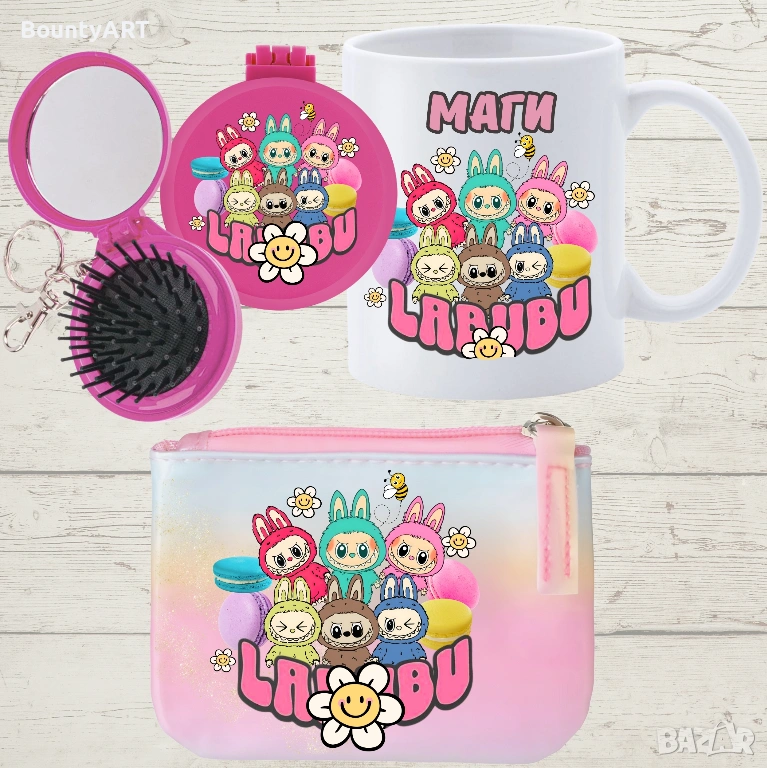 Персонализирана чашка с име+ сгъваемо огледало с гребен, портмоне за важни съкровища – комплект Лабубу мечта за момиченца!