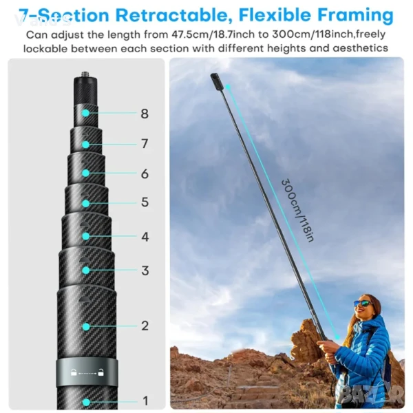 【Водоустойчив материал от въглеродни влакна】Селфи стикът е изработен от въглеродни влакна, които съчетават здравина и издръжливост, водоустойчивост и устойчивост на ръжда, което позволява използването му в дъжд, сноуборд и сърф.