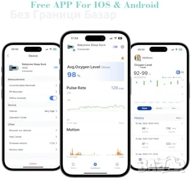 Нов Бебешки Монитор Смарт Чорап ViHealth Пулс + Кислород + Движения