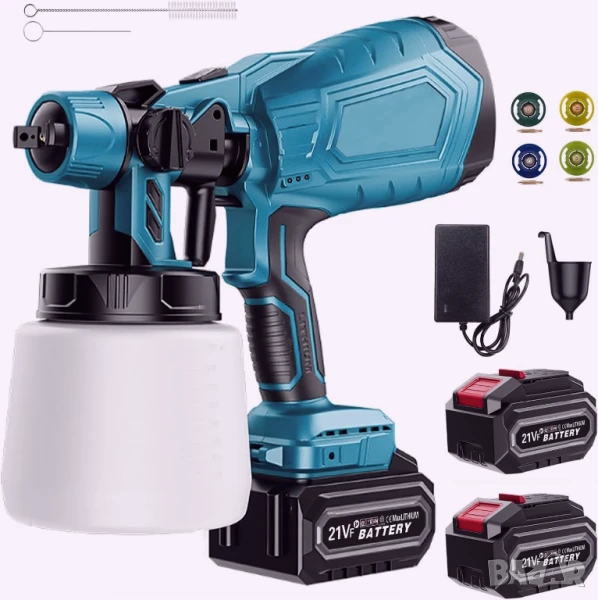Съдържание на опаковката: пистолет за боядисване; 2 броя литиево йонна батерия 3000mAh, чаша за вискозитет - 1 бр.; игла за почистване - 1 бр.; четка за почистване - 1 бр., адаптер за зареждане на батериите 1 бр,