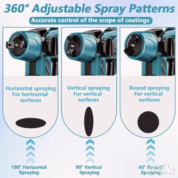 Предлага прецизни модели на пръскане, за да създаде гладко и превъзходно покритие. С 3 модела на пръскане: хоризонтална, вертикална и кръгла, можете да избирате различни модели на пръскане според вашите реални нужди. Идеална за пръскане на маси, столове, огради, автомобили, вътрешни стени и т.н. Безжичният дизайн ви позволява да се отървете от смущенията от кабели, така че да можете да работите свободно и ефективно. Лек и мощен, този удобен инструмент може да се инсталира само за няколко минути.
