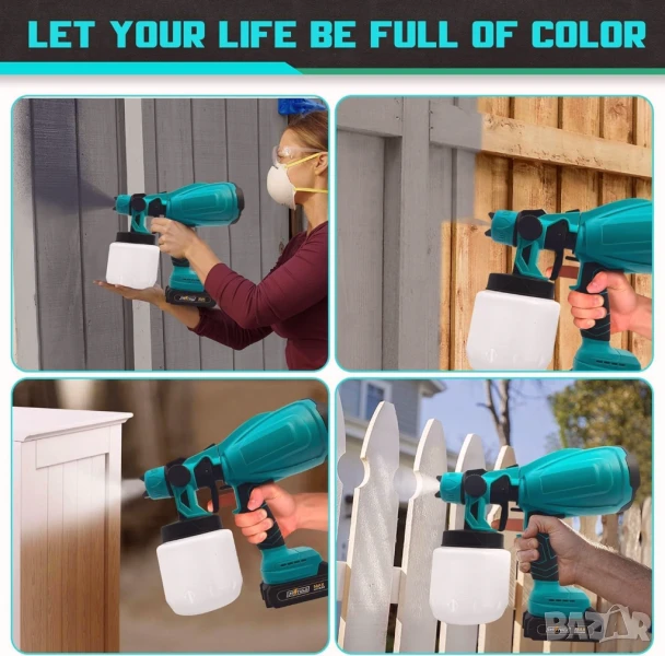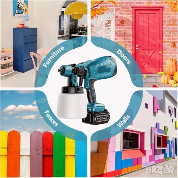 Този акумулаторен пистолет за боядисване 18V е домакински продукт, предназначен за пръскане на течни вещества върху различни повърхности. Може да се нанася върху всякакви вътрешни и външни повърхности.