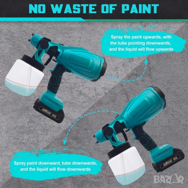 【Безжичен и лесен】Пръскачката за боя боядисва стена 8 пъти по-бързо от четка, спестявайки време и труд. Големи площи, като стени, тавани, външни облицовки и огради, които трябва да бъдат напръскани, също могат лесно да бъдат обработени. Не се притеснявайте, че кабелът е твърде къс за употреба навън, защото безжичната пръскачка за боя ви позволява да се отървете от смущенията от кабели, така че да можете да работите свободно и ефективно.