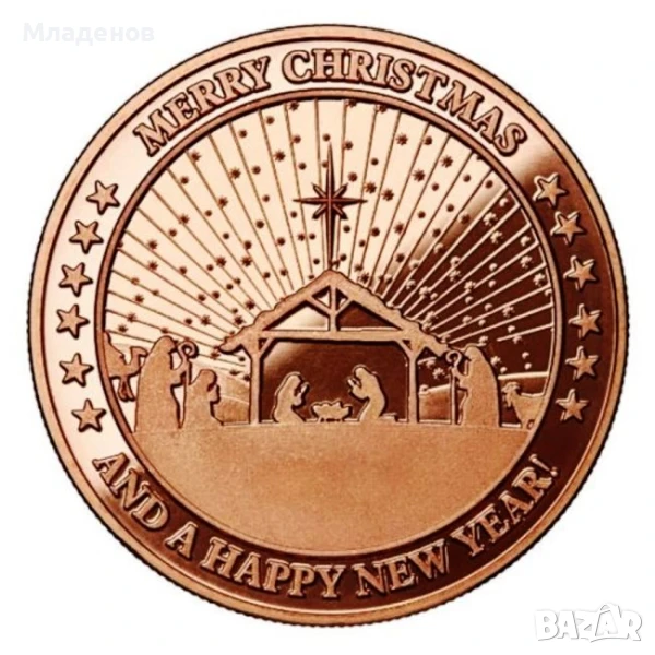 Коледен венец , Коледна елха , Коледа Рождество Христово . Метал: Мед Чистота: 999 Диаметър: 39 мм ,Тегло: 28,35 грама, една AVDP (international avoirdupois ounce) унция . Това е исторически много стара англо-американска единица за тегло. Произведена от Монетния двор на Голдън Стейт (GSM)