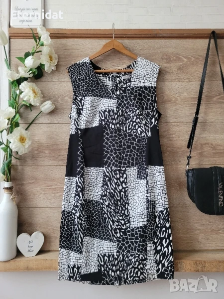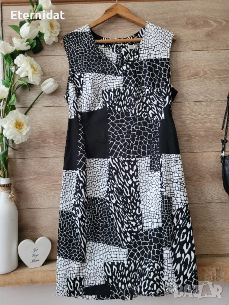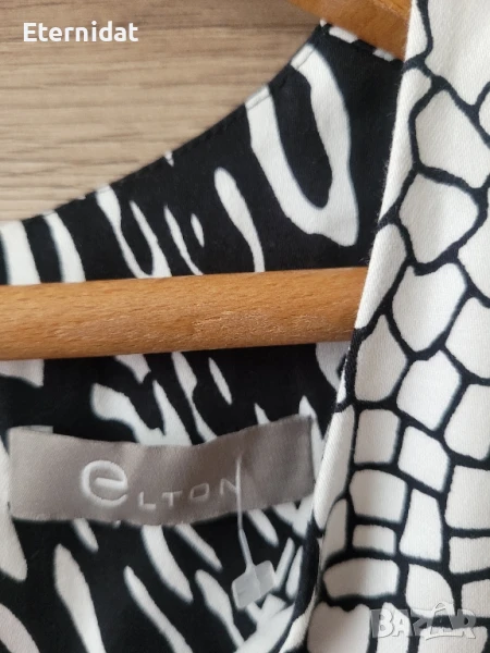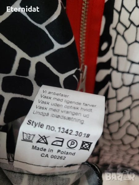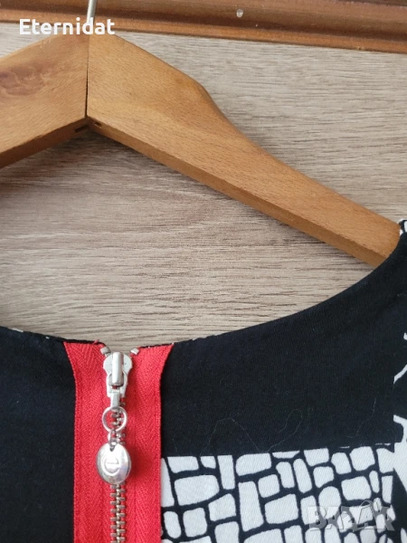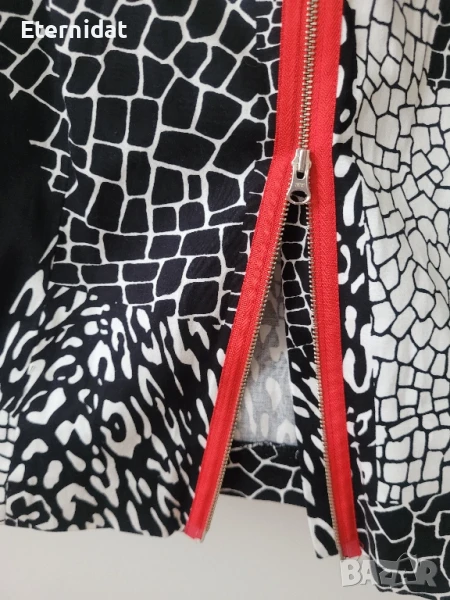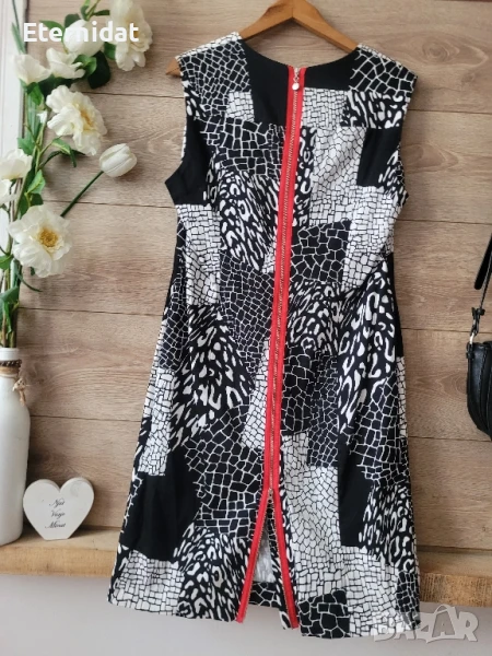 Стилна рокля черно и бяло ELTON. През цялата дължина на гърба минава червен цип, което я прави още по-стилна и изящна! Пришит метален знак с логото на марката най-отдолу. За елегантна визия, а защо не и за ежедневието с кецове. Материята е хубав стегнат памук с еластан. Производство Полша. Размер 42 Л. Дължина 96см, гръдна 94-102см. Не е носена. Цена 55лв
