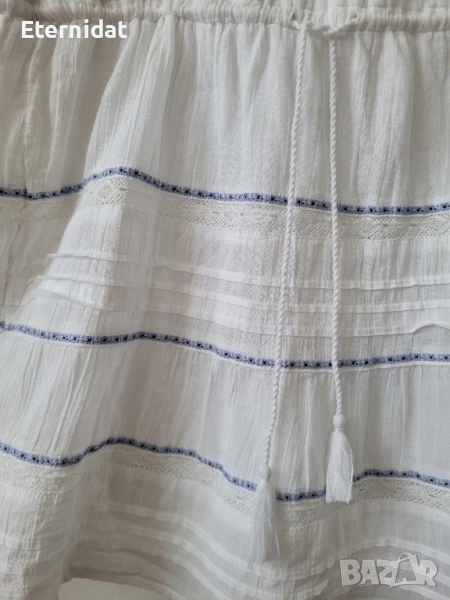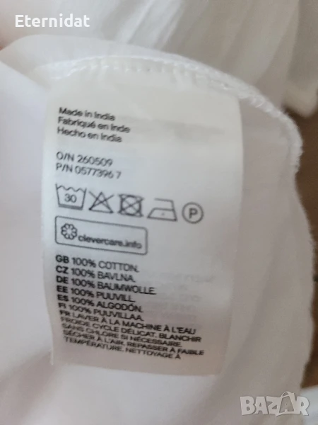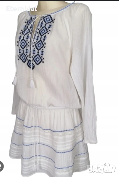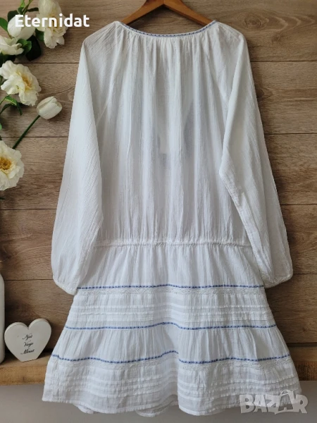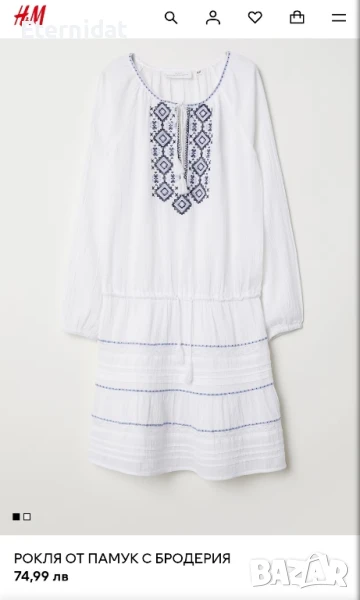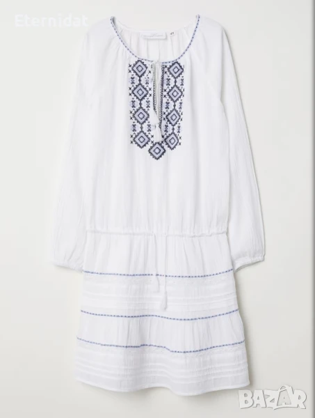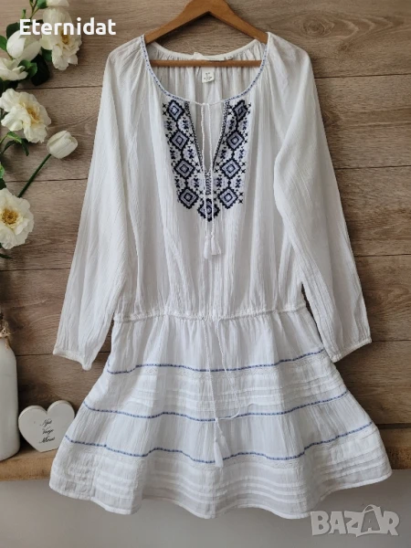 Рокля от 100% памучна материя с бродерии H&M. Допълнителна подплата ( не прозира! ). За ежедневието със сандали, лека, комфортна и супер удобна за ежедневието или за плажни разходки. Може да се носи свободно или пристигната в талията по избор. Размер 44 ХЛ. Гръдна до 120см, дължина 95см Реалната и цена в сайта е 75лв. Моята е 45лв