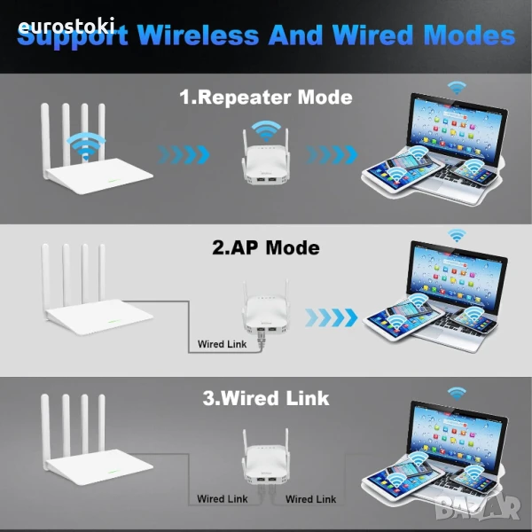 Wi-Fi разширител с Ethernet порт и ретранслатор/точка за достъп, за да превърнете кабелна интернет връзка в безжична точка за достъп: Разширител на обхват (който се свързва безжично към съществуваща безжична мрежа и усилва/излъчва сигнала) или Точка за достъп (която се свързва безжично към интернет или към съществуваща мрежа чрез Ethernet и след това излъчва безжичния сигнал)