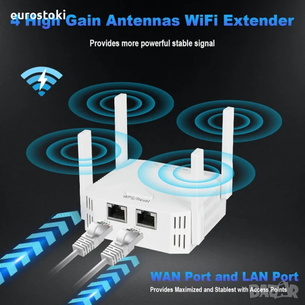 WiFi усилвател, 1200Mbps WiFi ретранслатор Ethernet порт, 2.4GHz/5GHz двубандов, защита от смущения, 4 *антени, покрива до 74 кв. метра и 45 устройства, на работа в реле/точка за достъп