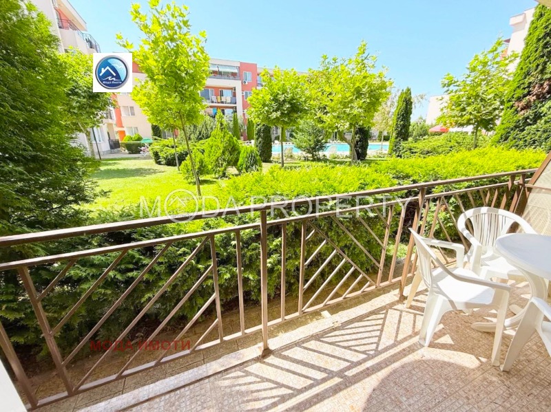 Просторно студио, напълно обзаведено и готово за нанасяне Изглед към басейна Партерен етаж лесен достъп Затворен и охраняем комплекс Всичко необходимо наблизо: магазини, кафенета, спирки на градския транспорт Само 10 минути пеша до плажа
