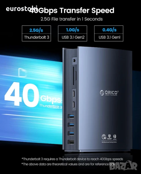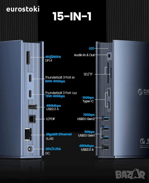 15-в-1 докинг станция Thunderbolt 3, сертифицирана от Intel: с 2 Thunderbolt 3 порта, 2 x USB 3.1 Gen 2 Type C 10 Gbps, 1 x USB 3.1 Gen 2 A 10 Gbps, 2 x USB 3.1 Gen 1 A 5Gbps и 2 x USB 2.0 A 480 Mbps, DP 1.4, RJ45 LAN Gigabit Ethernet порт, четец на SD/TF карти, аудио вход и изход, S/PDIF OUT. Докинг станцията за лаптоп ORICO е по-мощна, стабилна, с по-бързо охлаждане, по-бърз трансфер на данни, дори отговаря или надхвърля вашите разнообразни ежедневни нужди.