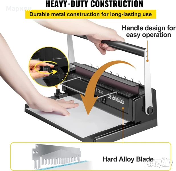 Дизайнът на дръжката я прави лесна за работа и може бързо да пробие и затвори спиралата. Притежава тава за хартиени отпадъци е за удобното им изхвърляне.