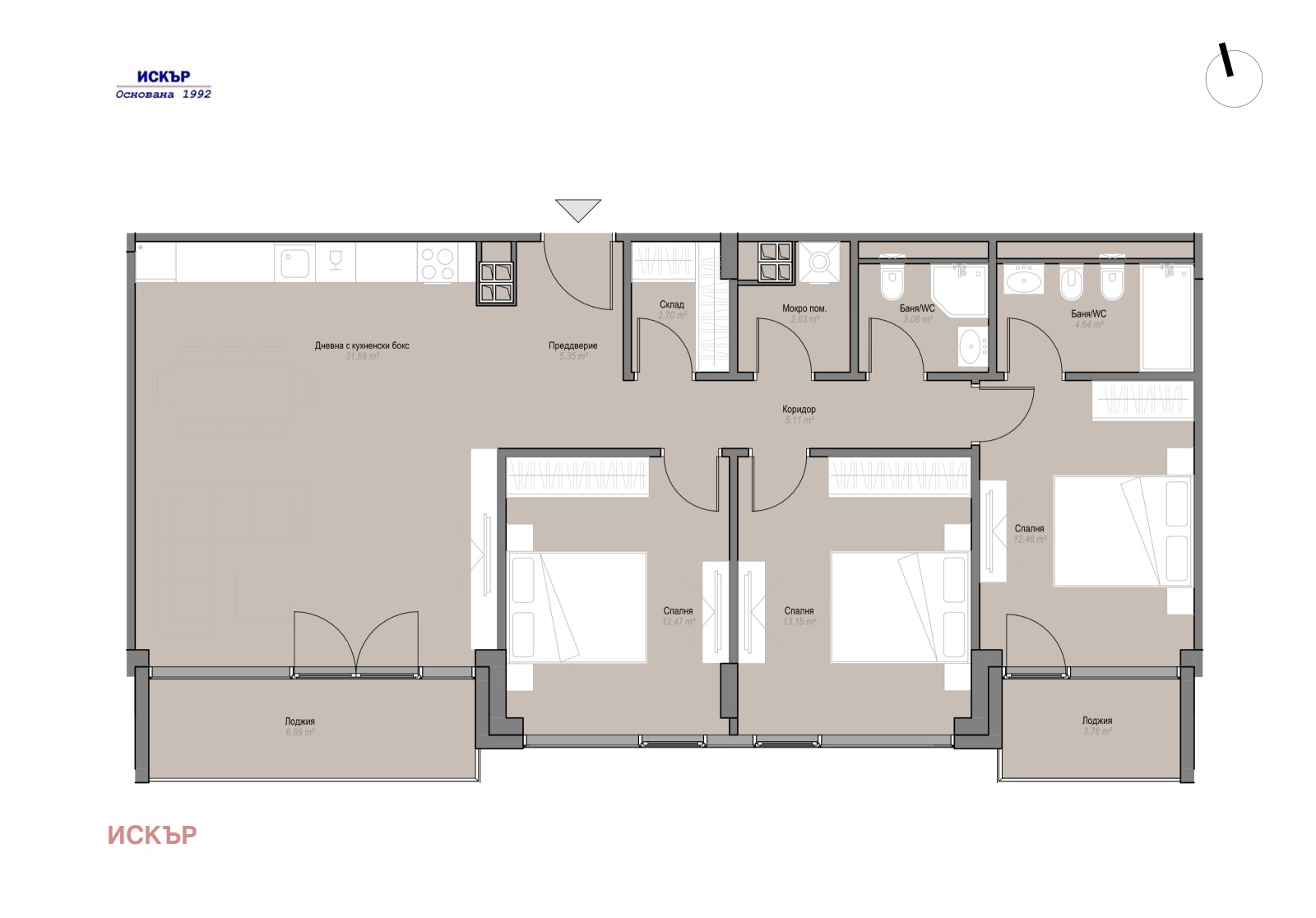 БЕЗ КОМИСИОННА ОТ КУПУВАЧА. Четиристаен апартамент с 3 спални, дневна с трапезария и кухненски бокс, 3 бани с WC, входно преддверие, тераса и складово помещение. Изложенията са югозапад и североизток. Сградата е с акт 14,със срок на завършване лятото на 2026г.Възможност за закупуване на подземен гараж.