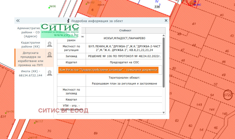 ПИ 68134.6722.144 гр. София, район Панчарево, м. ГРАДИНА /ИЗТОК/, вид собств. Частна, вид територия Земеделска, НТП Овощна градина, площ 515 кв. м, стар номер 144.