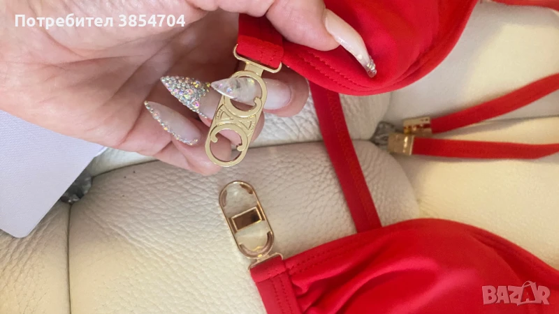 Впечатляващ бански бикини Селин в червен цвят със златни елементи Celine. Нов, с етикет размер С, М . Всички реквизити, отлично качество. Изпращам с тест . Благодаря Ви, че разглеждате профила ми и приятно пазаруване !