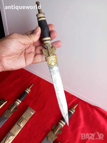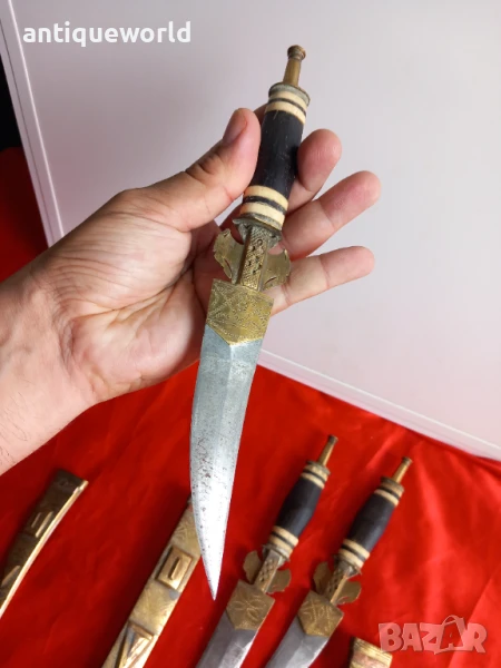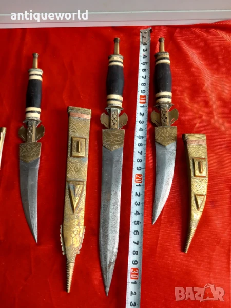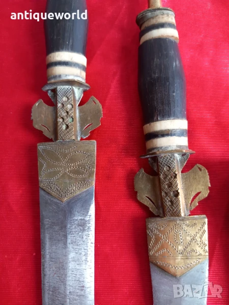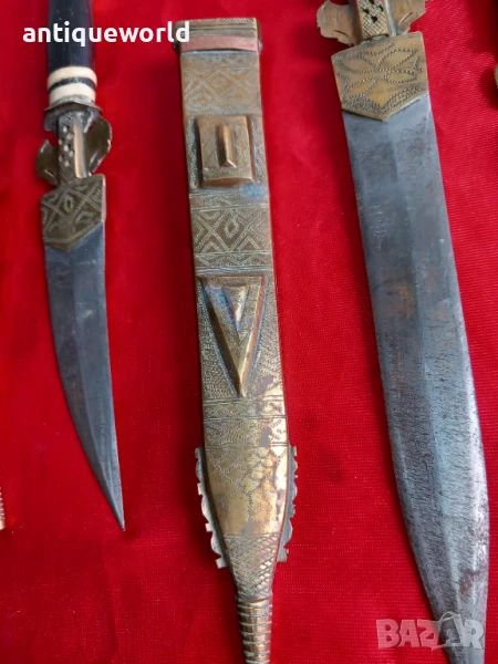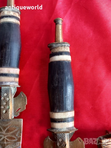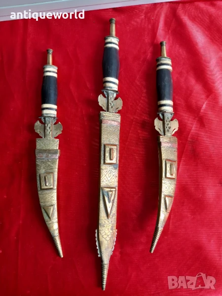 Колекция от Три Супер Редки Северно Африкански Дагери,Кинджали от Сенегал. Здрави Заострени Остриета , Дръжки Дърво и Кост със Месингови Изображения на Слон, Бронзова Кания. В отлично Състояние.