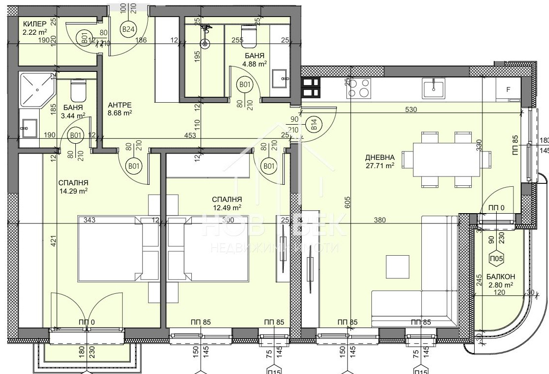 Имотът е с чиста жилищна площ ot 94.05 кв.м.. и се състои от: коридор, дневна с кухня и трапезария, две спални, един балкон , баня с тоалетна, килер/перално, втора тоалетна . Към всеки имот ще бъдат включени съответните идеални части от общите части на сградата, както и от земята върху която ще бъде изграден обекта.