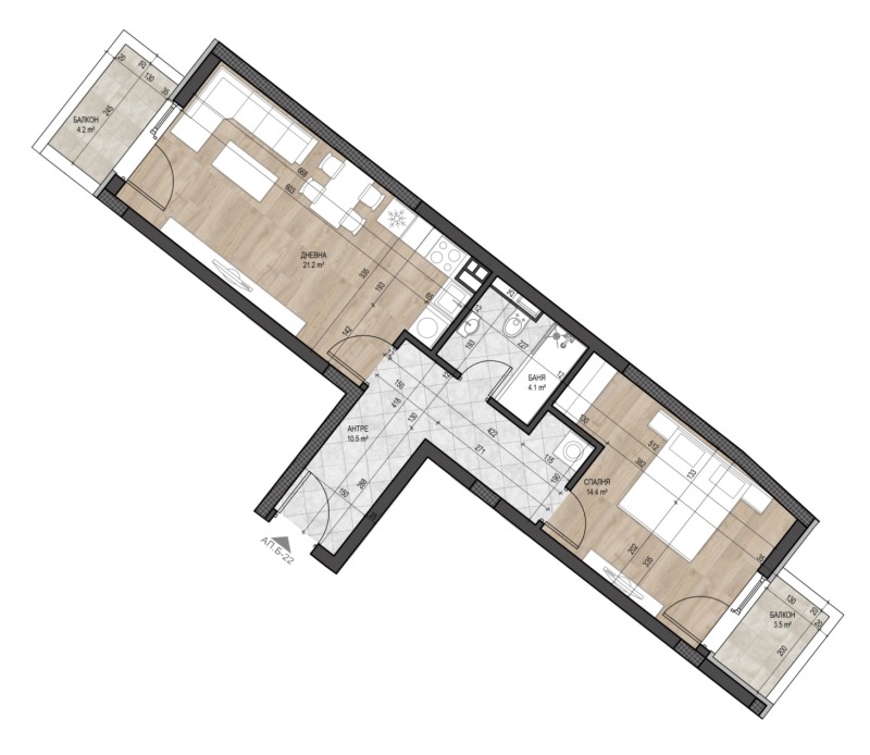 H2U Ви представя просторен и светъл двустаен апартамент, състоящ се от голяма дневна, спалня, склад и санитарен възел. Разположен на среден етаж във висококачествена сграда с акт.15, акт.16 до края на 2025г. Апартаментът се намира в комплекс с г образно разположение и луксозна визия, контрол на достъп, богато озеленяване, места за отдих и спортни площадки. Комплексът се състои от четири свързани сгради между 7 и 9 етажа и е разположен на тихо и спокойно място, същевременно на комуникативна локация на 2 мин. от МОЛ. ,,БЪЛГАРИЯ'', на 10 мин. от МОЛ. ,,ПАРАДАЙС'' и на 5 мин. от Южния Парк. Сградите ще бъдат захранени с ТЕЦ и изводи за климатици във всяко помещение.