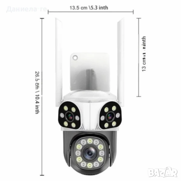 Резолюция: 12 MP (4K Ultra HD); Обектив: 3.6 mm, широкоъгълен 105°; Видео компресия: H.265; Нощно виждане: 8 инфрачервени + 8 бели LED диода, обхват до 30 m; Аудио: Вграден микрофон и високоговорител (двупосочно аудио); Мрежа: Wi-Fi 2.4 GHz, двоен усилен сигнал; Приложение: iCSee (Android/iOS); Съхранение: Поддръжка на microSD карта до 128 GB и облачно съхранение; Водоустойчивост: IP66; Работна температура: -20°C до +60°C; Захранване: DC 12V/1A; Размери: 26.5 × 13.5 × 13 cm; Тегло: 750 g.