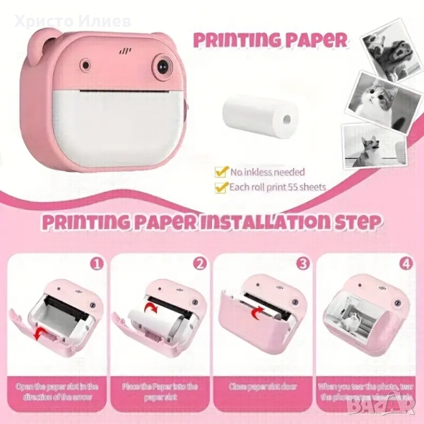 розов мини фотоапарат за деца, с дизайн на меченце. Той има екран и камера, а от долната част излиза принтирана снимка. Фотоапаратът е идеален за деца, които искат да правят снимки и веднага да ги отпечатват. Устройството е лесно за използване и предлага забавление за малките фотографи.