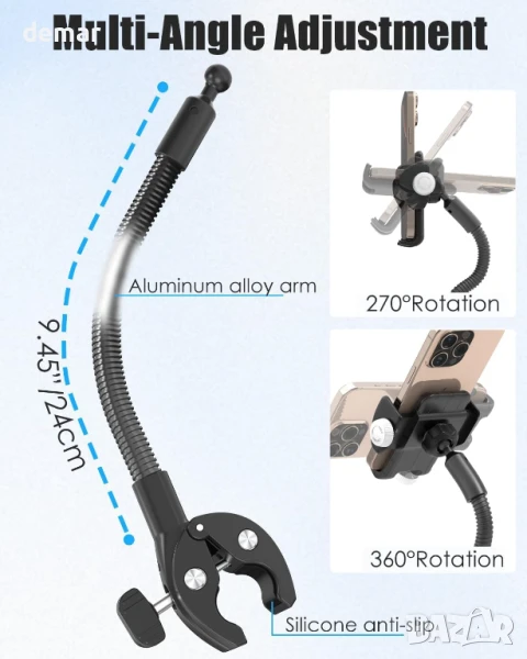 Тази поставка за телефон разполага с универсална сферична глава, въртяща се на 360°, и гъвкаво рамо с форма на гъша шия от 33 сантиметра с допълнителна регулируема секция за персонализирано позициониране по време на тренировка. Сигурната ѝ скоба с неплъзгащи се гумени подложки осигурява здраво захващане за кормилото без надраскване на повърхностите, осигурявайки стабилност и защита от удари. Подходяща за кормило, щеки или тръби с диаметър от 1,3 до 4 см, тя е подходяща за повечето велосипеди, мотоциклети и подобни съоръжения. Регулируемата поставка е подходяща за устройства с ширина от 55 мм до 90 мм, покривайки повечето съвременни смартфони, а неплъзгащата се силиконова подложка предотвратява подхлъзване или надраскване, което я прави надеждна както за тренировки на закрито, така и за каране на открито.