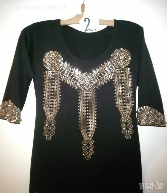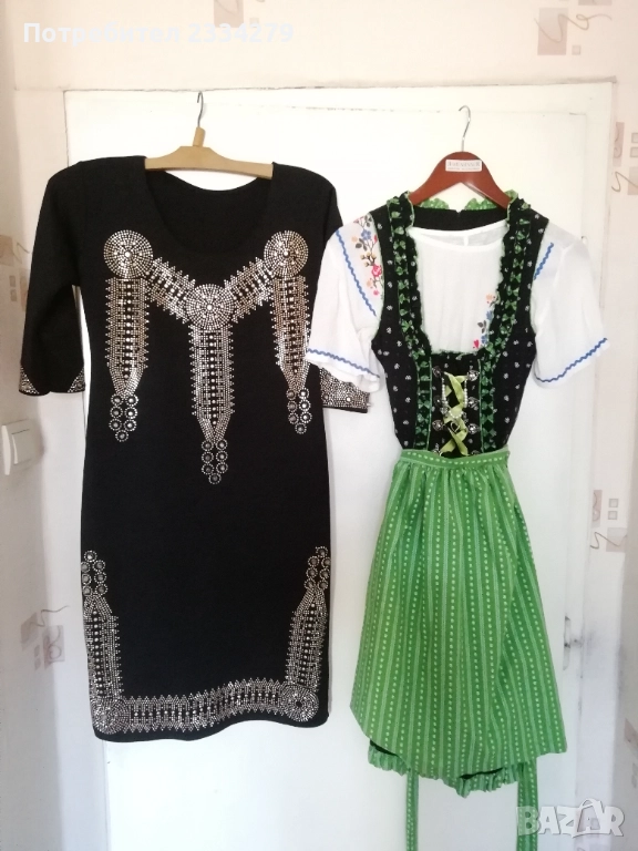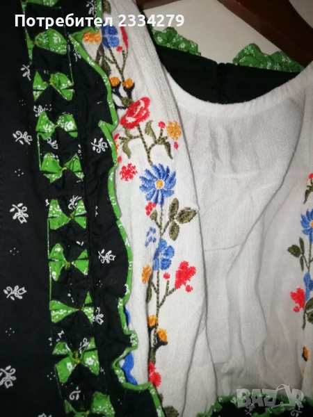 риза с бродерии, обувки от естествена кожа N:37, цената за всичко 35€.; N:2 НЕУПОТРЕБЯВАНА официална елегантна рокля с фолклорни мотиви, ръчна орнаментирана изработка, размери: дължина 95см., широчина от рамо до рамо 40см., гръдна обиколка 78см., талия, еластичен плат за това че може и размерите да се овеличават, цена 13€.