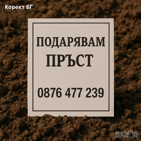 ПОДАРЯВАМ голямо количество пръст / земна маса в град Габрово - подходяща за: обратен насип озеленяване строителни и ландшафтни дейности и други. 📍 Намира се в град Габрово, ул. Свищовска. ⚠️ Условие: Вземането, товаренето и транспортът са изцяло за ваша сметка. 📞 За контакт: 0876 477 239 Моля, обадете се за повече информация и уточняване на детайли.