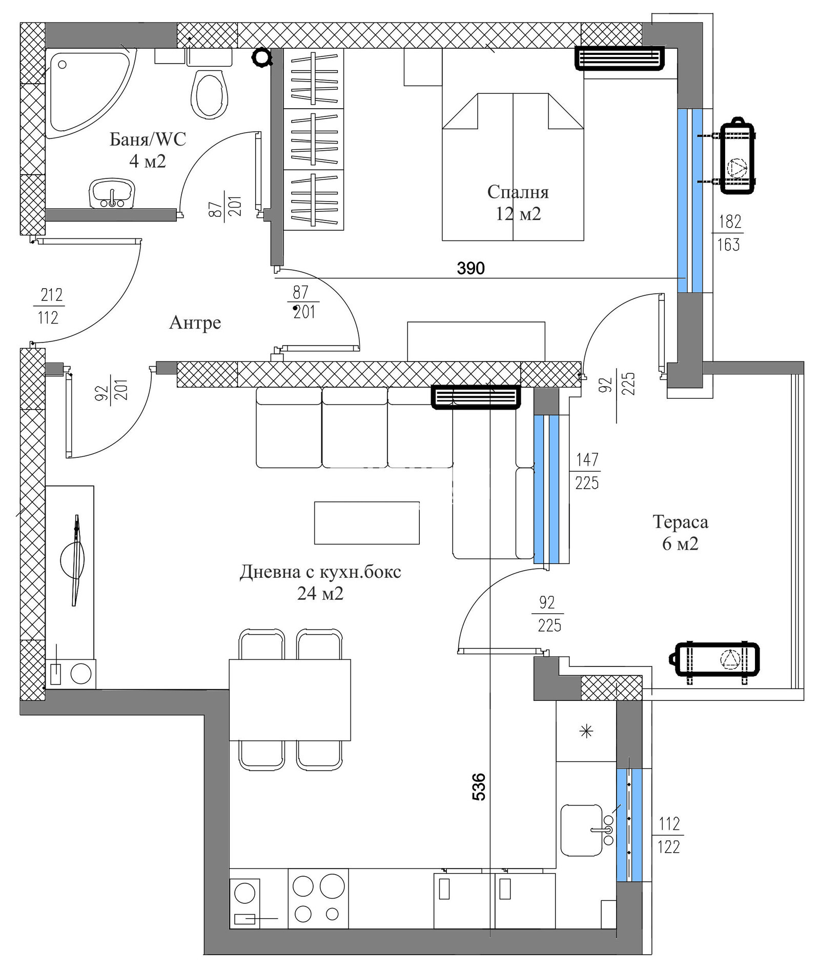 Разпределения - Предлагаме на Вашето внимание двустаен вътрешен апартамент с изцяло южно изложение, състоящ се от дневна 24кв.м. с трапезария и кухненски бокс с излаз на обща тераса, една самостоятелна спалня 12кв.м., баня с тоалетна и входно антре. Към апартамента има прилежаща изба от 3кв.м. включена в цената.
