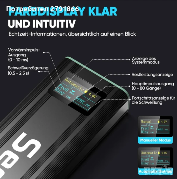 - OLED дисплей с функции за безопасност: цветният OLED дисплей показва в реално време системния режим, мощността, състоянието на предварително загряване, забавянето и напредъка на заваряването. Включва защита срещу ниско напрежение, свръхток и презареждане за безопасна и надеждна работа.