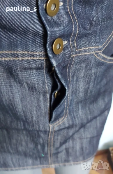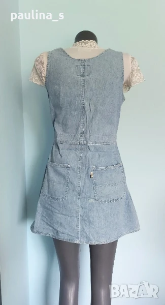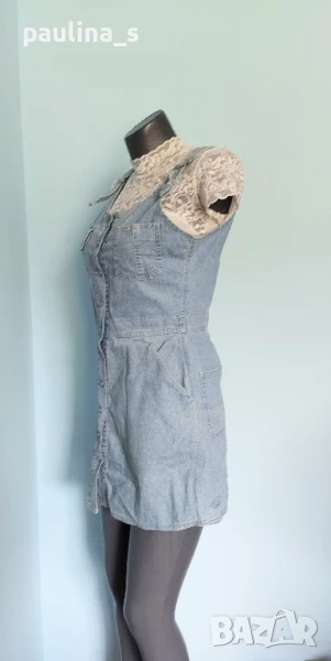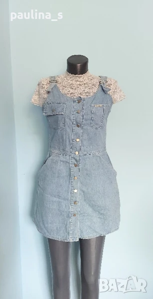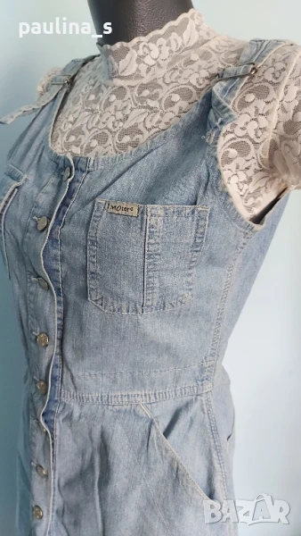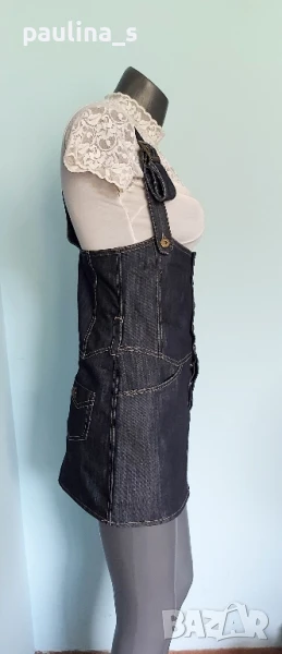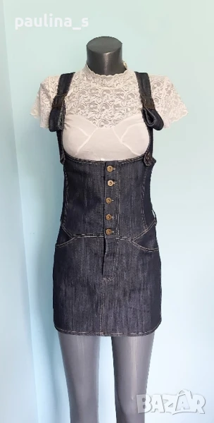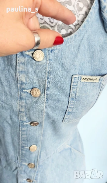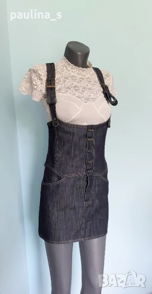 1️⃣. S / M - "Olympia" fashion. Цената е крайна 29,99лв / 15 евро. Дънков сукман, българско производство. Моделът е с корсет в горната част, открит бюст, закопчаване отпред под гърдите, метални оксидирани копчета. Джобовете отпред с ниско разположени на нивото на ханша, гайките са широки. Долната част е дънково мини стандартен Denim, задни джобове, презрамките се регулират с токи, светли тегели. Много прецизно и качествено изработен. Нов, без дефекти и етикет.