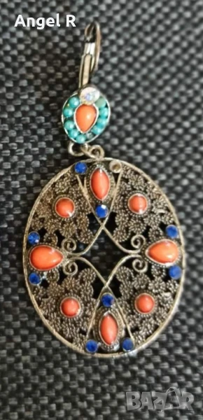 Обеците са на метална основа с разноцветни камъчета. Дължина с държача 8 см, но елипсата 4/3 см.