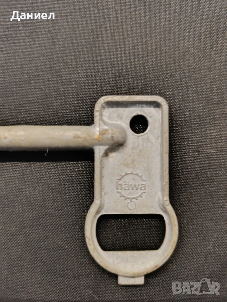 Това е специален вид ключ, наречен спирателен ключ за радиатор или ключ за термостатичен радиаторен вентил. Този конкретен модел е произведен от марката Häwa (германска компания, специализирана в електроинженерни и шкафови системи), но в случая ключът най-вероятно е за отваряне/затваряне на стари парни или водни радиатори или технически шкафове.